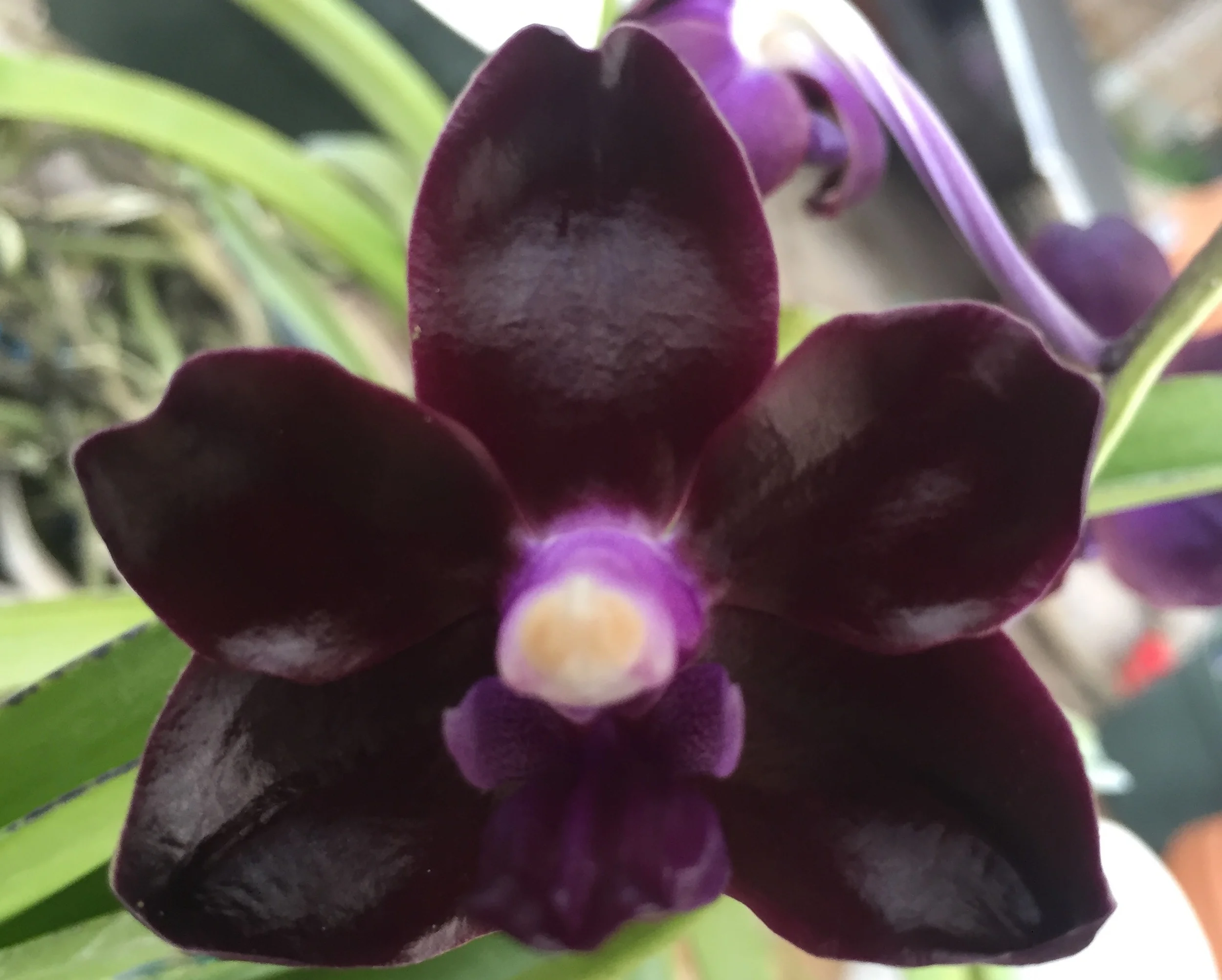 Close-up of a dark purple or black orchid flower with purple accents on a green stem, supported by a wire fence in a greenhouse. View fullsize