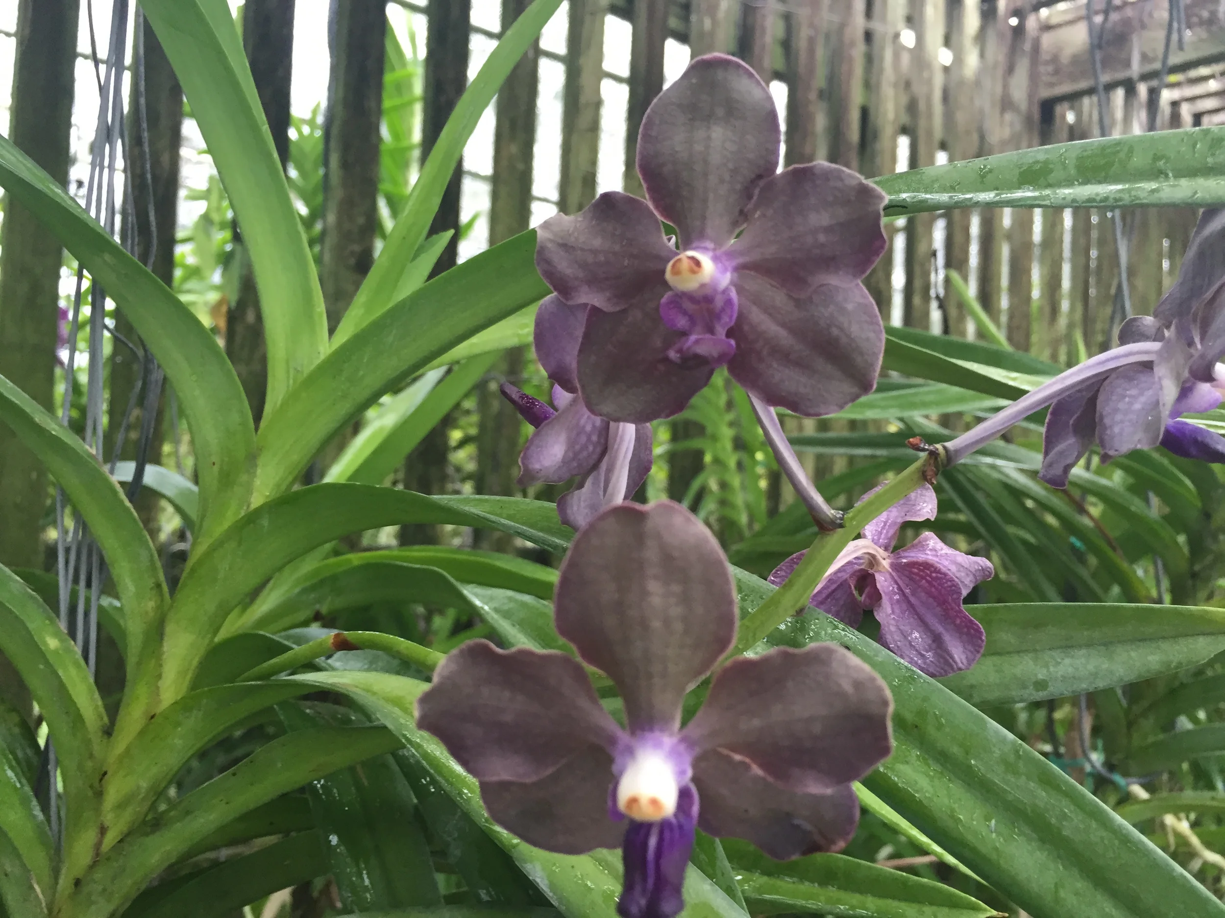 A close-up of a cluster of brown and purple orchids with green leaves in the background, inside a greenhouse.