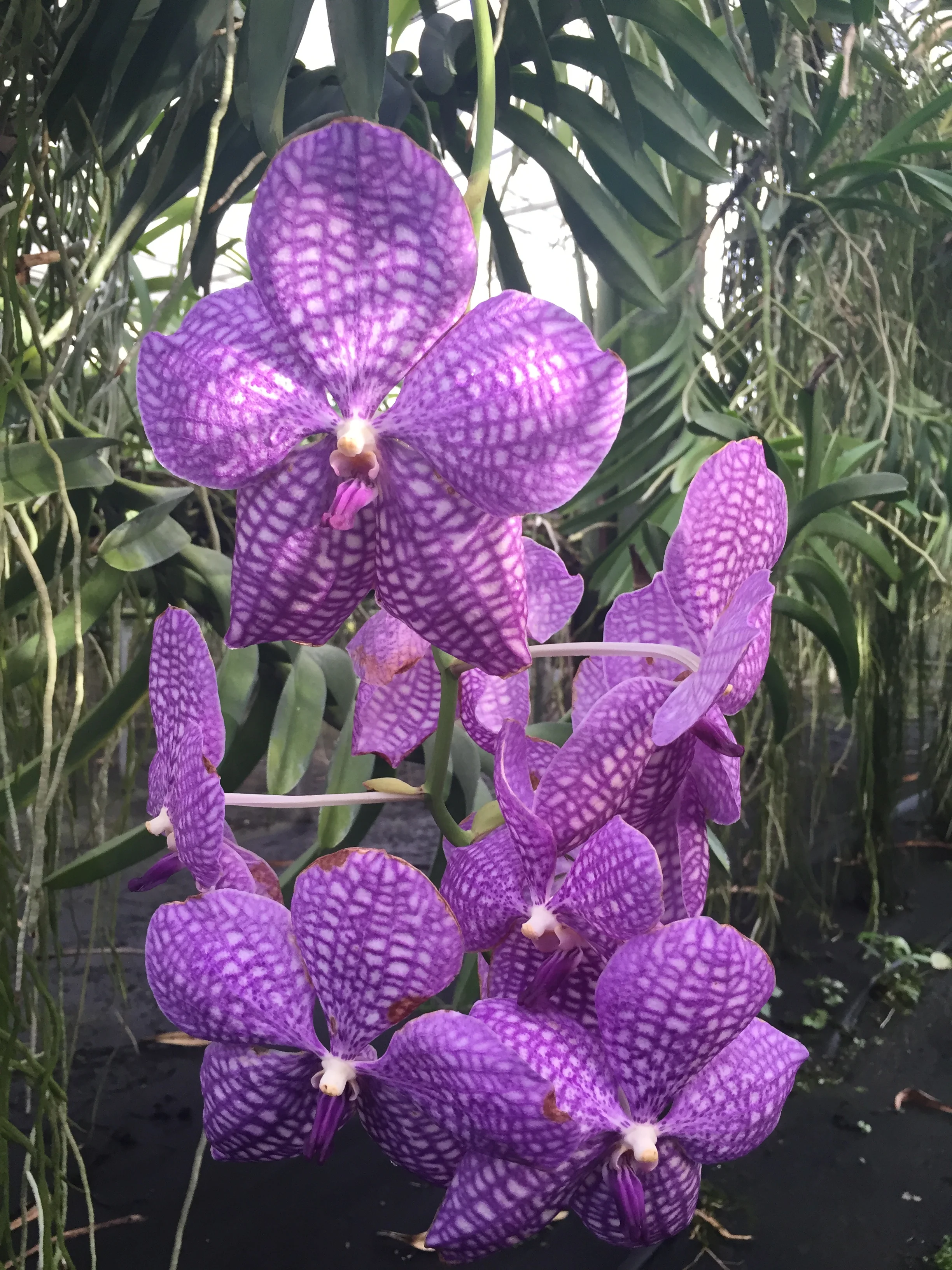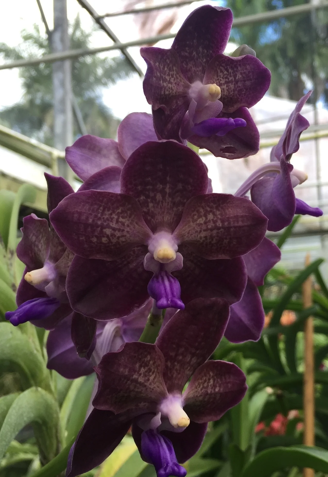 Purple orchids growing inside a greenhouse with a metal roof and green plants in the background. View fullsize