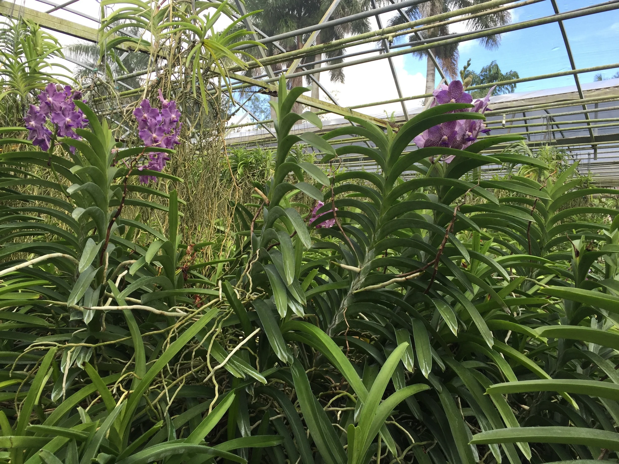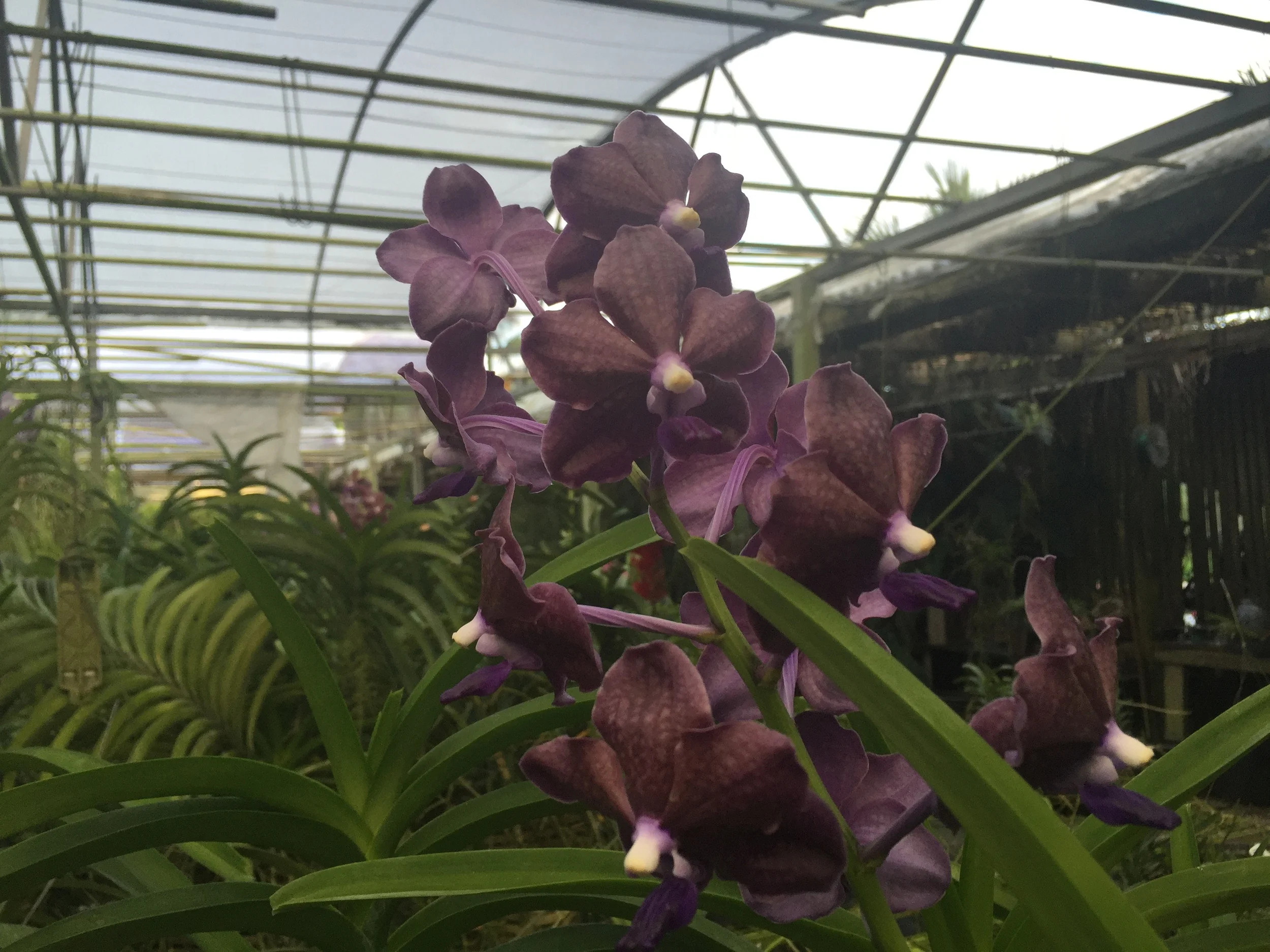 Purple orchids growing inside a greenhouse with a metal roof and green plants in the background.