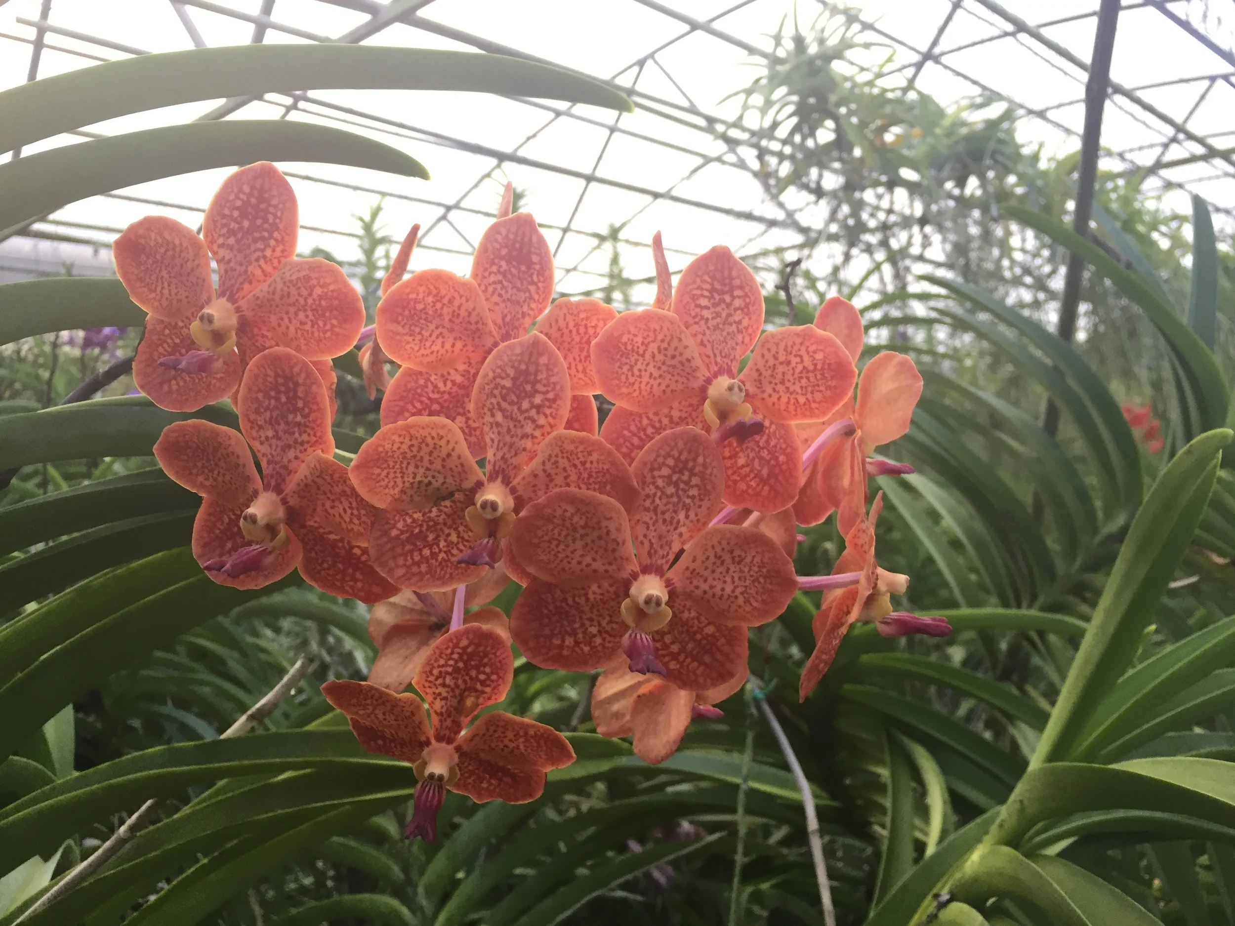 Close-up of orange and pink speckled orchid flowers in a greenhouse with green foliage and a metal structure in the background.