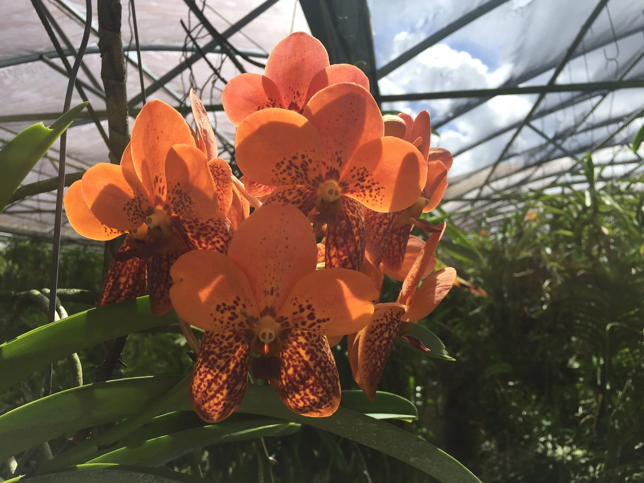 Close-up of orange and red spotted orchids inside a greenhouse with a glass roof and green foliage. View fullsize