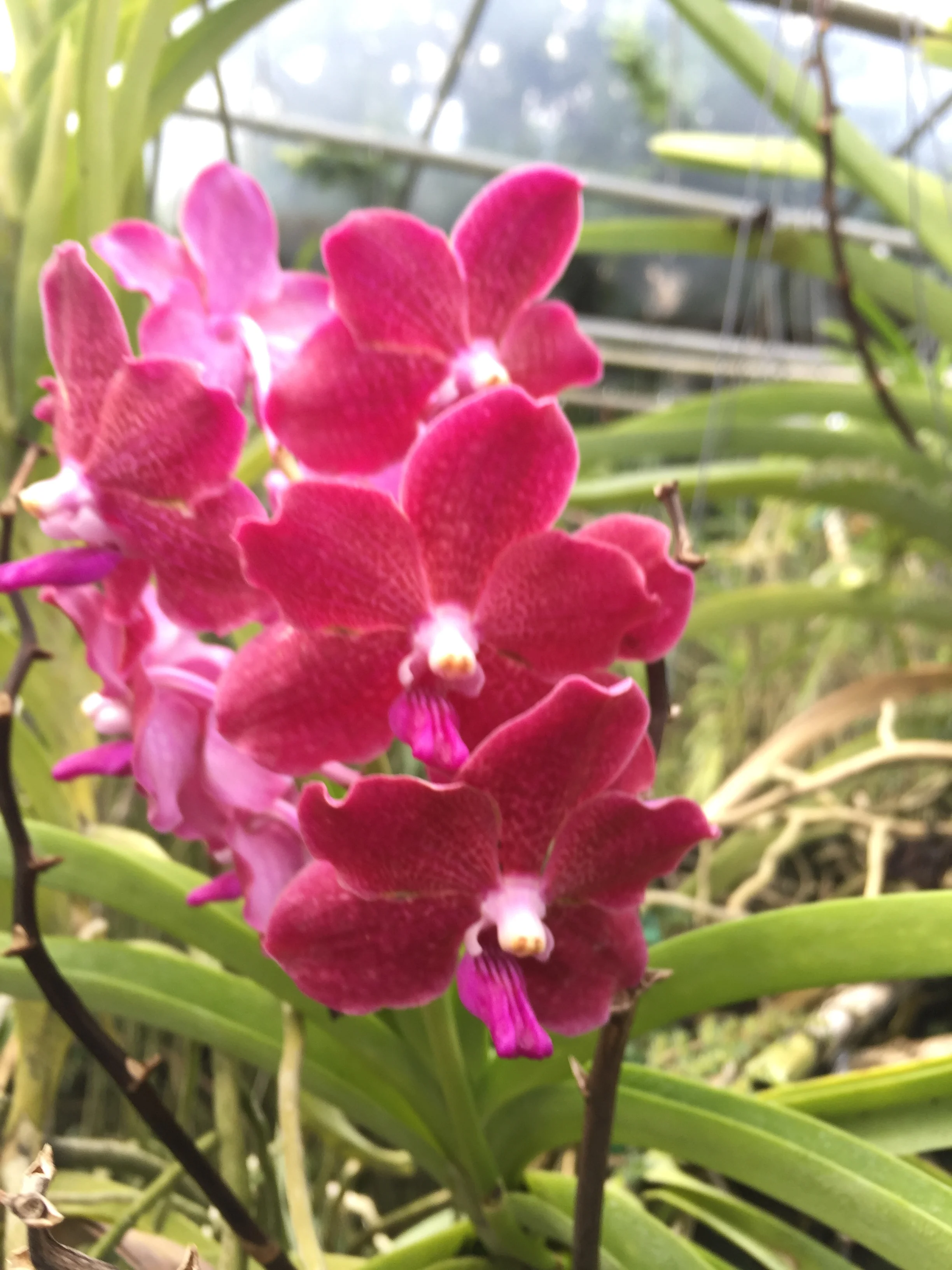 Pink orchid flowers in a greenhouse with metal supports and green foliage.